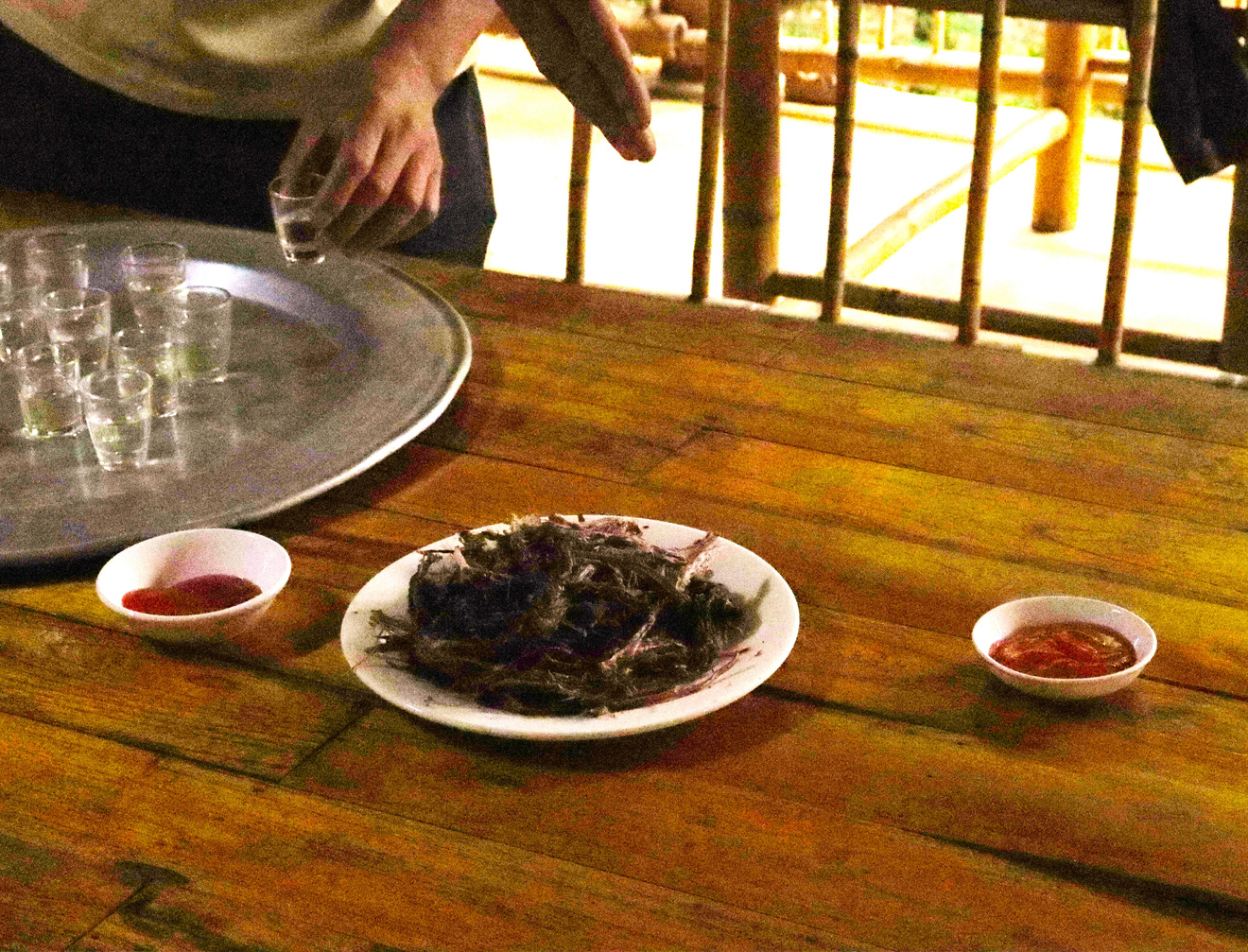 After our first group interview, we were invited to share rice wine and taste traditional dried buffalo meat. In the picture below, you can see the buffalo meat at the center, torn into long, flavorful strips and served with a spicy red dipping sauce. Alongside, small cups of rice wine adding to the experience.