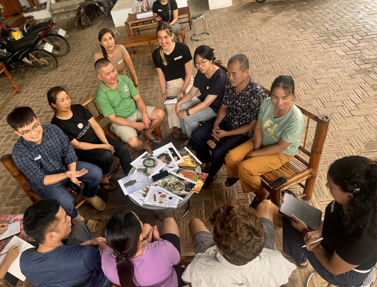 The focus groups began with participants looking at pictures of traditional local dishes. They introduced themselves by sharing the stories and meanings behind their chosen dish. This helped build pride and created a comfortable space for discussing food supplies, community ties, and future hopes. The image below shows the participants sitting in a circle with the dish pictures in the center.